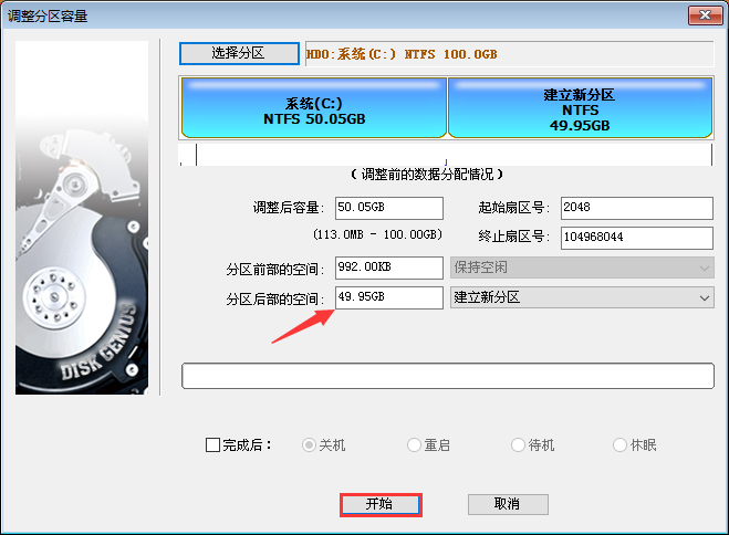 接下来可以根据自己的需要调整新分区的容量,一般默认即可,然后点击开始。