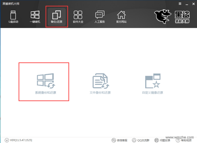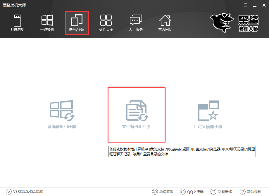 1.打开黑鲨装机大师。来到“备份/还原”选项卡下,选择“文件备份和还原”。
