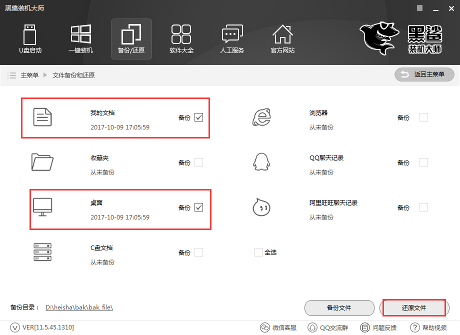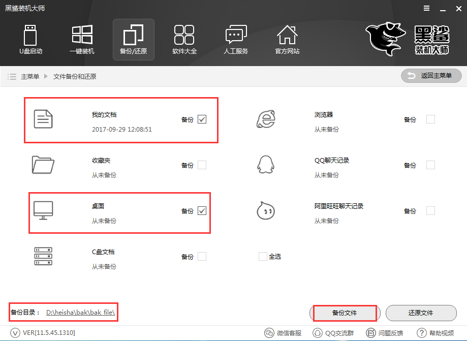 2.接下来勾选需要备份的文件,然后点击备份文件即可。备份目录默认是在黑鲨装机大师的目录下,也可以自行进行设置。