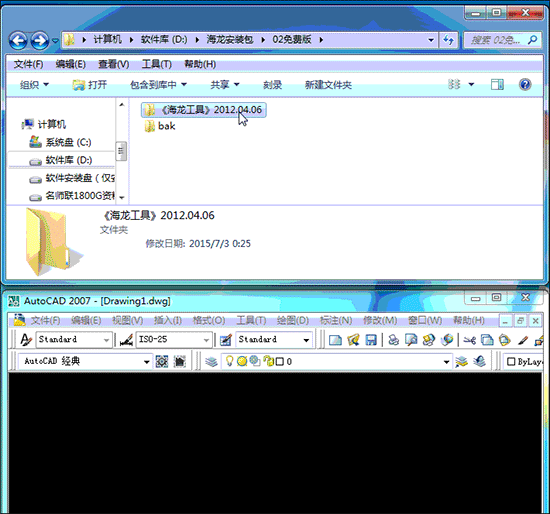 第一种安装方法:打开CAD软件,解压安装包后进入“《海龙工具》”文件夹,双击安装按钮“《安装》.vbs”完成安装。