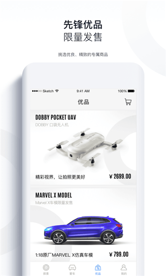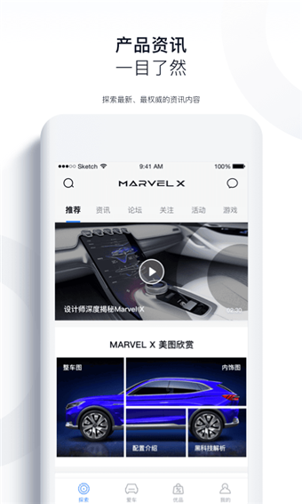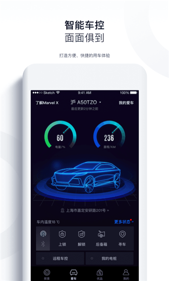 [探索]:权威的资讯、官方社区论坛、缤纷活动[爱车]:看车、购车、智能控车、车况显示等,全新的用车服务体验