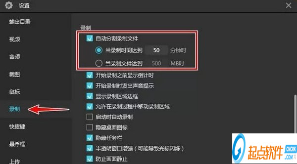 如果您对录制时长或视频大小有额外要求,你可以提前设置“自动分割录制文件”功能。在“设置”—“录制”下,您可以选择在录制到达特定时间或录制文件达到某个大小限制时,自动分割录制文件。