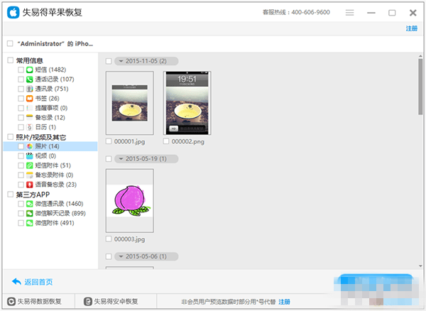 失易得苹果恢复是一款专业的苹果手机数据恢复软件,它有友好的使用者体验和向导操作,您只需三步骤即可恢复数据,即使您不熟悉也可以轻松通过电脑操作找到丢失的数据,它可以恢复iPhone/ipad的丢失数据,包括照片、视频、通讯录、书签、提醒和日历等。步骤1:将您的iOS设备连接到PC,或者打开您的iTunes备份。