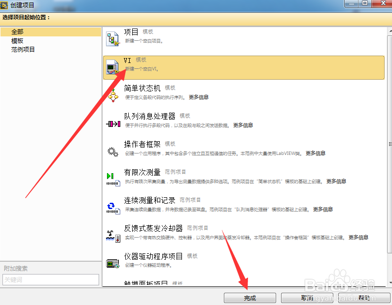 点击完创建项目后,会进入到另一个界面,让你选择所见项目类型,我们前期选择VI就可以,因为labview都是一个个VI组成的。我们点击创建空白VI,点击完成。