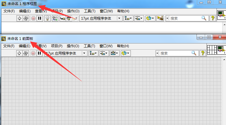 这时候就会弹出两个面板,一个为前面板,一个为程序框图。前面板为观看图,也是存放工具插件的地方,而程序框图是你搭建这些工具所连接的框图,也是编写界面。