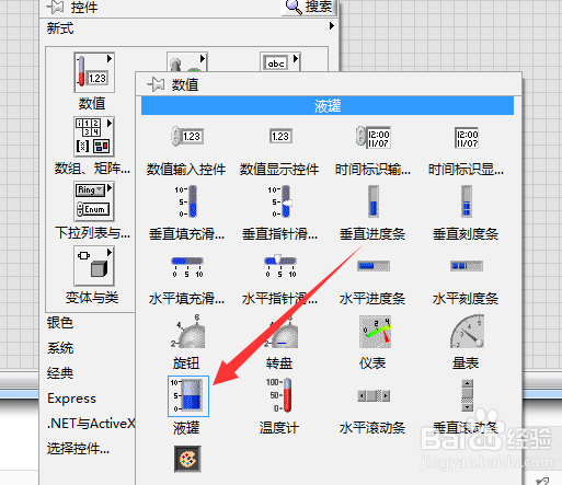 前面板我们可以放一些控件,然后用程序框图所连接,如图,我们编写一个容积的小程序,在前面板选择一个控件。选择数值中的液罐,在程序框图也会显示出来。