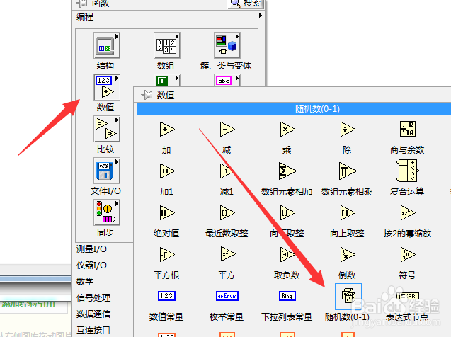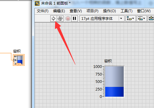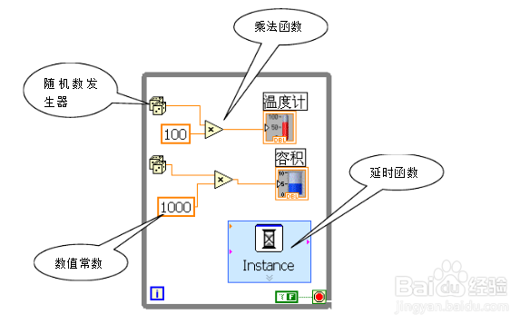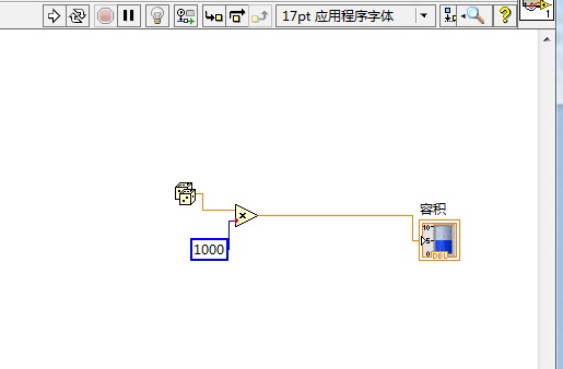 然后在程序框图中右击加入一个随机数,再加入一个相乘的函数,填上数值写上1000,并与容积相连接。如下图所示: