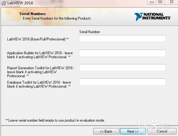 如下四个serial Number 可以先不输入,而使用试用版软件:LabVIEW 2016 ,Application Builder for LabVIEW2016,Report Generation Toolkit for LabVIEW2016,Database Toolkit for LabVIEW 2016,直接点击Next;