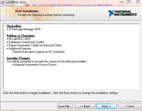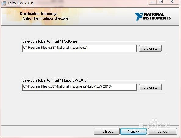 选择NI软件安装路径(Select the folder to install NI software)或者保持默认C:\Program Files(x86)\National Instruments\点击Next;选择LabVIEW软件安装路径(Select the folder to install NI LabVIEW2016)或者保持默认C:\Program Files(x86)\National Instruments\LabVIEW2016\;然后点击Next;