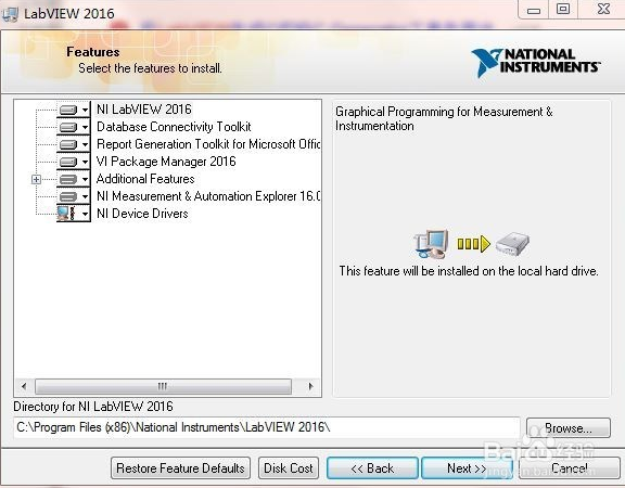 选择需要安装的额外功能(Select the feature to install)以及安装目录(C:\Program Files(x86)\National Instruments\LabVIEW2016\),点击Next;