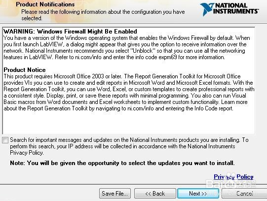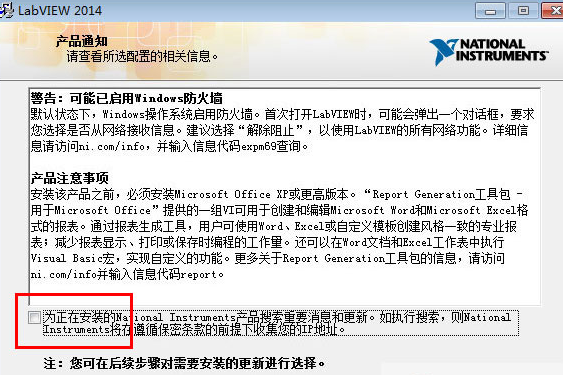 选择是否接受所安装NI公司产品的的升级机会和重要通知信息,如果同意,则你的IP地址将会被NI公司收录;(Search for important message And updates ON the National Instruments Products you are installing .To perform this search ,you IP address will be collected in accordance with the National Instruments privacy policy);
