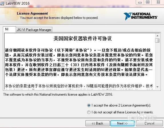 许可协议,包括:1)美国国家仪器软件许可协议和2)JKI VI Package manager;此处必须选择同意(I accept the above 2 License Agreements);