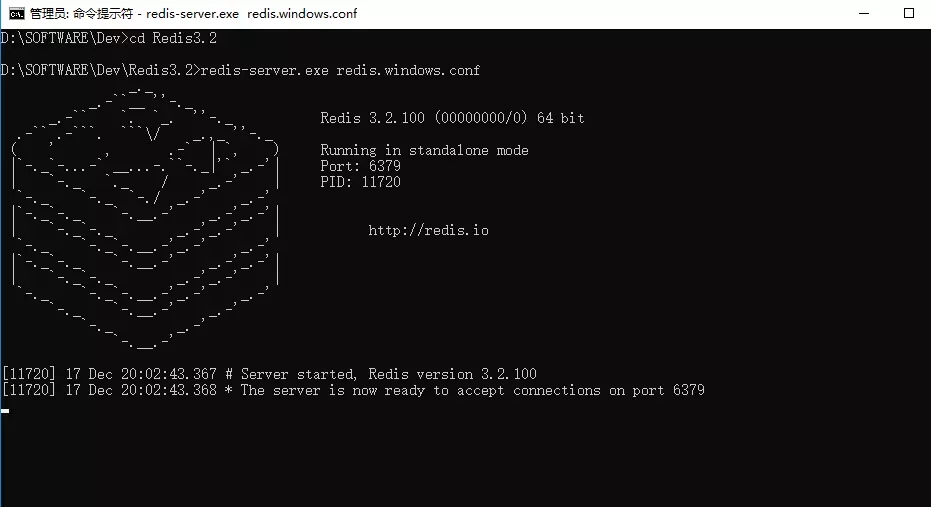 首先启动redis服务,这里为了演示,使用的redis的Windows版本,安装在本地来测试的。平常项目开发中,使用的redis都是在远程服务器上的。但连接和使用方式基本一样。进入redis目录,双击redis-server.exe启动redis服务,出现如果的页面,表示启动成功
