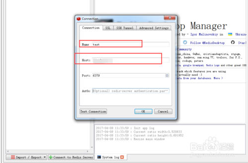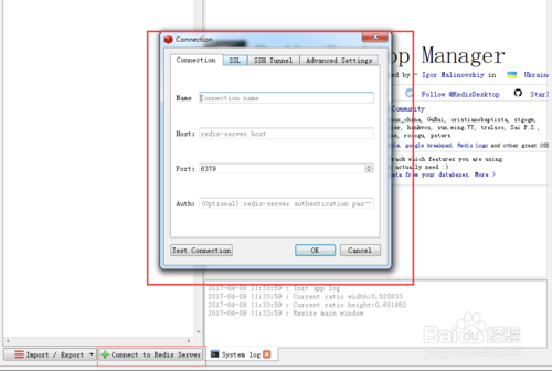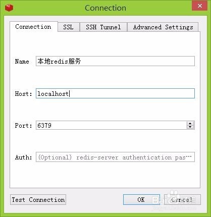 输入连接名称,输入Host主机名称或地址,输入端口号,默认6379端口,Auth是密码字段,如果redis服务器设置了密码验证,则需要填写,没有设置,为空即可