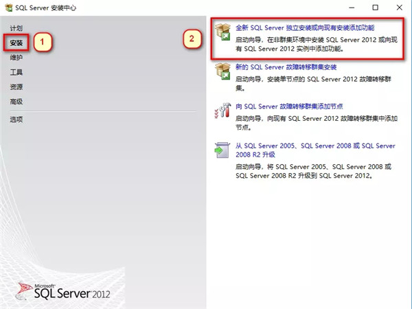 3.点击主安装程序左侧菜单栏的“安装”->“全新SQL Server独立安装或向现有安装添加功能”。
