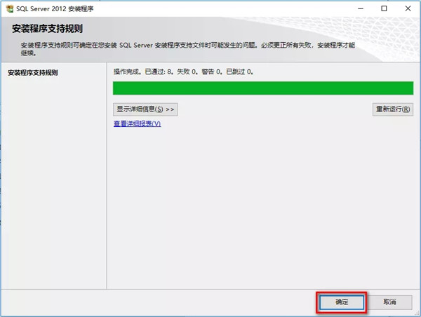 4.点击安装之后,安装程序将会检查安装程序支持规则,检测系统是否满足安装需求。规则检查完成,直接点击“确定”,进入下一个流程。