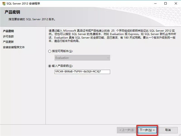5.产品密钥:本文给出的镜像文件自带产品密钥,程序默认填入了,无需用户再输入,此处直接点击“下一步”即可。