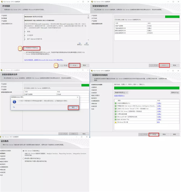 6.下面是许可条款、安装安装程序文件、弹出的需要重新启动计算机的提示框、安装程序支持规则、设置角色的步骤。均使用默认的选项,一路确认、下一步即可,如下图,直到功能选择界面。