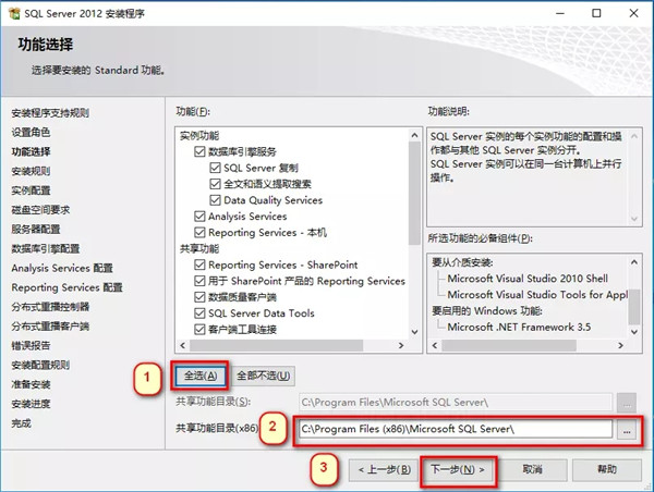 7.功能选择界面,如果不清楚要装哪些功能,可以直接点击“全选”,根据需要选择共享功能目录,然后点击“下一步”。