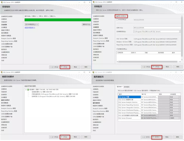 8.安装规则、实例配置、磁盘空间要求、服务器配置界面,均可采用默认安装的方式一路“下一步”,如下图,直到数据库引擎配置界面。