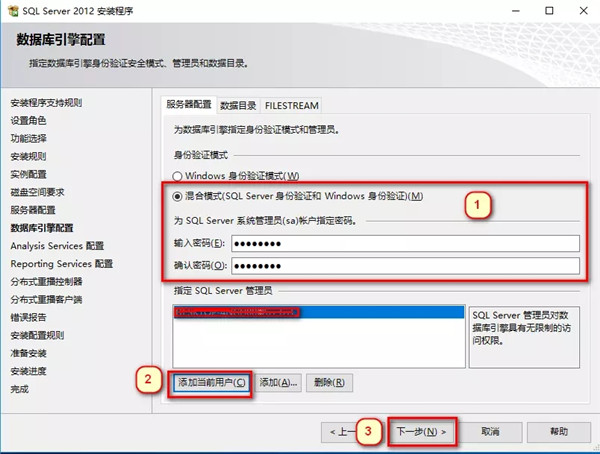 9.数据库引擎配置界面,选择“混合模式”,填入密码,点击“添加当前用户”按钮,会发现文本框中会多出一行用户,然后点击“下一步”。