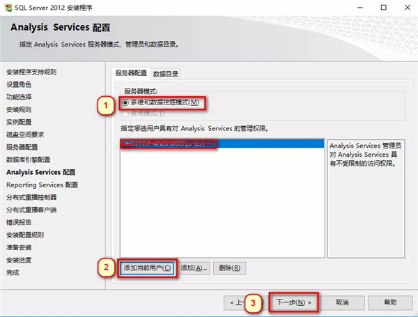 10. Analysis Services配置界面,默认选择了“多维和数据挖掘模式”,点击“添加当前用户”按钮,再点击“下一步”即可。