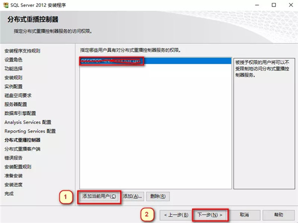 12.分组式重播控制器的访问权限界面,点击“添加当前用户”,再点击“下一步”。