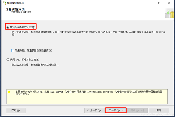 进入选择传输方法界面,选择“使用分离和附加方法”适用于大数据库迁移或数据库升级,速度快;选择“使用SQL管理对象方法”可以使数据库保持联机,但是速度较慢。本例选择“使用分离和附加方法”,点击“下一步”。