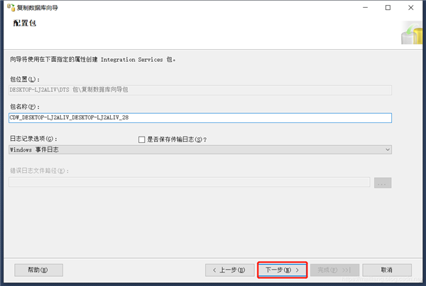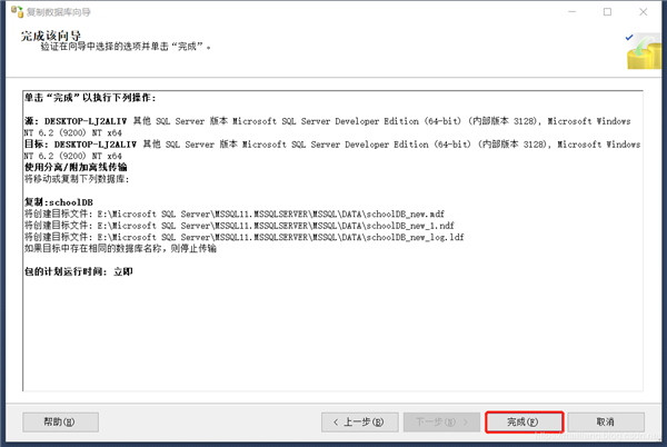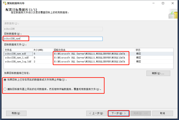 进入配置目标数据库界面,输入目标数据库的名称,数据库文件的保存目标文件夹,选择目标数据库存在时的处理方式,点击“下一步”。