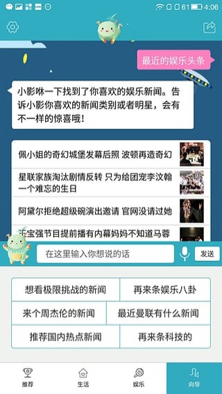 【资讯】直接发语音向小影查询感兴趣的新闻、近期电影及演唱会资讯。