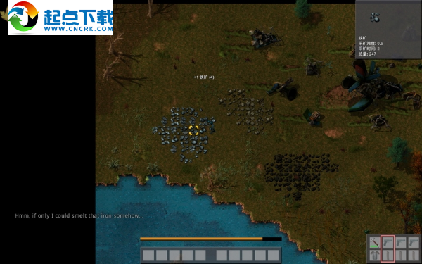 走近左边的一片铁矿,屏幕的右上角出现矿藏的说明:采矿名称、采矿难度、费时和总量,用斧头开采4份铁矿,再采一些石块,制作一座石炉。