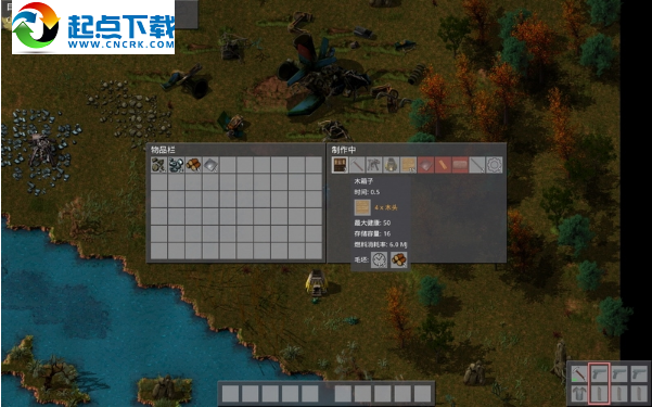 先熟悉下操作,WSAD移动,用鼠标在逃生舱的“大船残骸”调查一下,从里面拿到8块铁板。按E键打开制作菜单,在道具栏的右边是配方,配方上的数字表示当前的原料可以制作该道具的数量。
