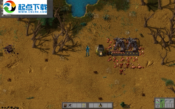 现在要调查东边的残骸,那边有两只小型沙虫和虫巢核心,小型沙虫会抛掷攻击,虫巢那里不断的有虫子朝主角攻击,所以不能贸然接近它们,而是在地上摆放炮塔并填装此前制造的棘轮弹盒,再用快捷栏里的新道具-石墙将它们保护起来,让它们自动清扫冲击过来的虫群,而主角不必忙于战斗,只是轻巧的奔跑躲闪就可以了。