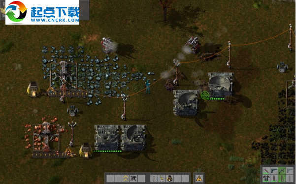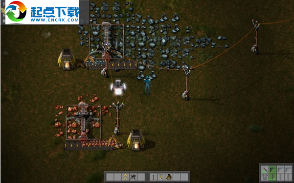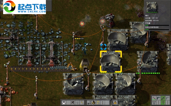 接下来造雷达,需要铁板和铜板,这就意味着要开采铁矿和铜矿,电能采掘机要比热能采掘机快得多。在附近的铁矿和铜矿上布置好生产线,再用电线杆将电力输送过去,给石炉加好煤,可以生产出铁板和铜板了。