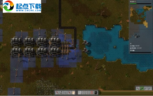 打开制作界面,看到可制造的东西多了起来,包括管道、锅炉、蒸汽机、路灯、供水泵、电路板、铜线、护甲等等。地上已经放好一部蒸汽机,现在制作一只供水泵,将它放到湖边,和蒸汽机设备连接起来。