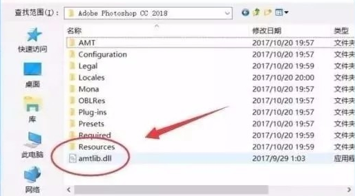 在弹出的窗口中找到PS CC 2018安装位置,选择下方图中“amtlib.dll”,然后点击【打开】