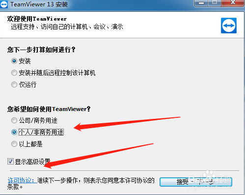 安装从本站上下载teamviewer安装包,点击安装包进行安装,这里需要注意是要勾选中【显示高级设置】,然后点击【接受】