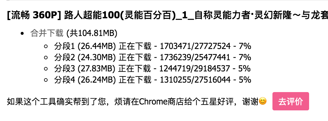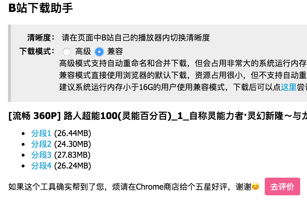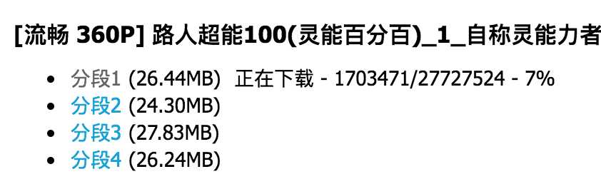 点击相应的分段链接即可直接调用浏览器的下载,兼容模式不怎么占用系统内存,但是不能合并分段,也不能自动重命名,开始下载后就可以关闭页面了