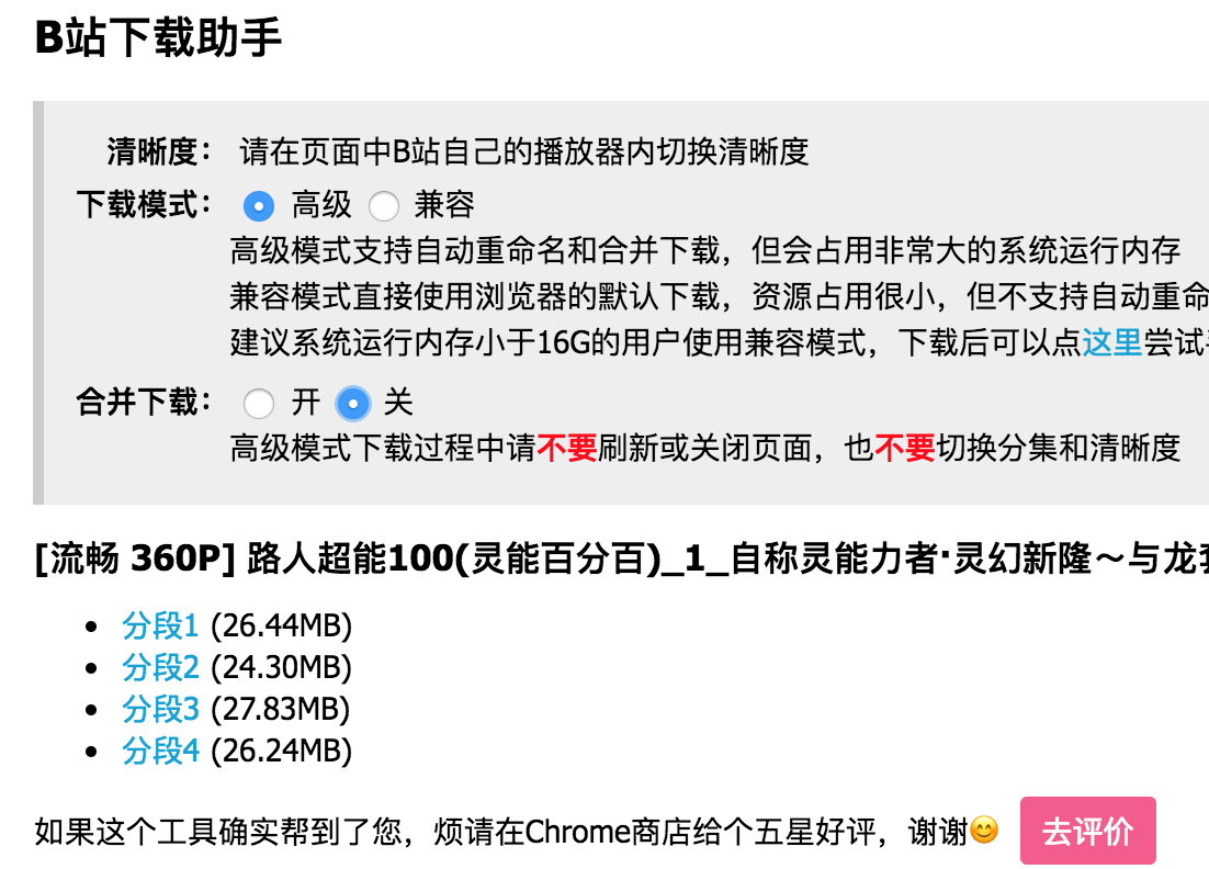 高级模式支持自动重命名和自动合并分段,会占用系统较大的运行内存,下载过程中不要刷新页面,否则只能重来。如果高级模式下载经常卡住,请尝试兼容模式
