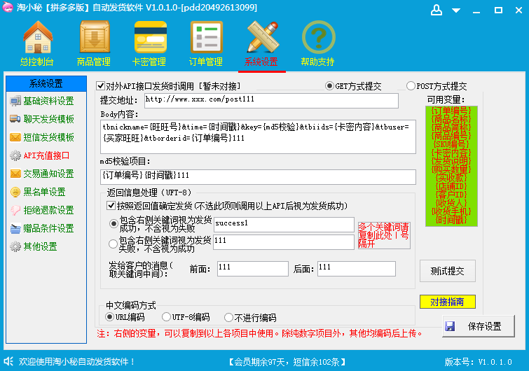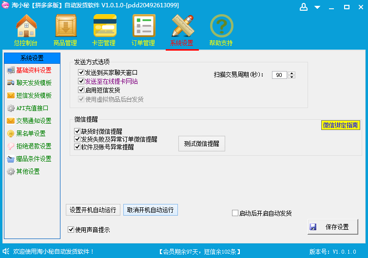 虚拟商品手工发货,精力靠不上,一不小心发迟了拼多多还有罚款。用我们的自动发货软件,只要您将要发送的内容在软件中设好,就不必再天天守着电脑,不用再担心发货延迟被罚款、回复率低被处罚,软件会自动将订单进行发货,并且有自动回复功能,提高您的回复率。软件支持任意虚拟商品的自动发货,无论是视频会员激活码、账号密码还是下载链接都可以自动发货,全自动挂机,解放双手。【软件特点】