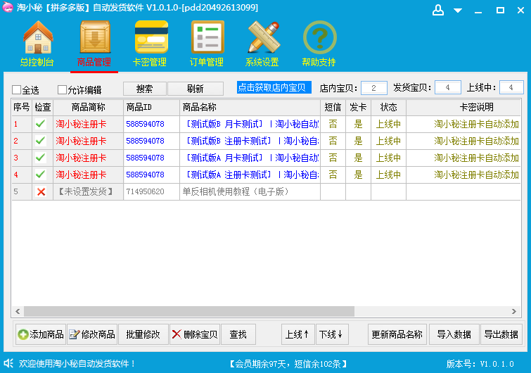 2019年6月26日更新:淘小秘拼多多版1.6.7.01.设置商品、添加卡密时检查违规词;