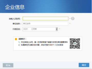 按要求填写纳税人识别号、单位全称和行政区划,完成企业信息注册。