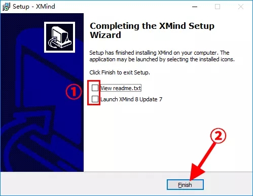 8、安装完成,取消勾选 View readme.txt 和 Launch XMind 8 Update 7 ,点击 Finish 并启动程序