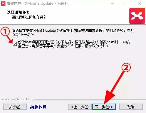 3、勾选 “修改hosts屏蔽联网验证” 选项,点击 下一步
