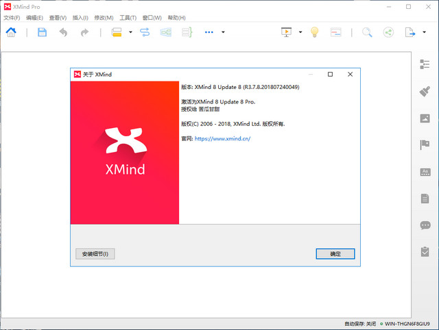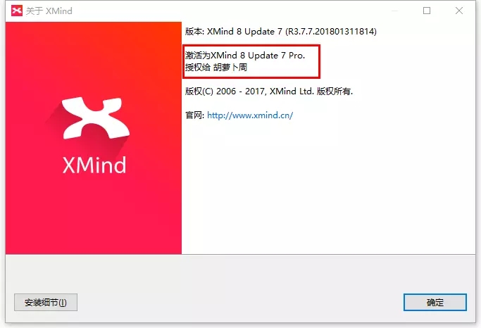 6、运行XMind软件,找到 “帮助”--“关于XMind(A)” ,查看红色框,显示已经完成破解。
