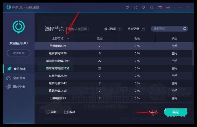 在网易UU网游加速器中我们可以点击”节点“(启动你的加速器,点击加号,然后搜索你要加速的游戏,比如流放之路,接着定位到你的游戏安装文件夹的启动程序,加入加速器成功,最后鼠标放在选项图片就可以打开节点选项了),然后在节点列表中可以看到各种模式,共4种模式,如下图所示: