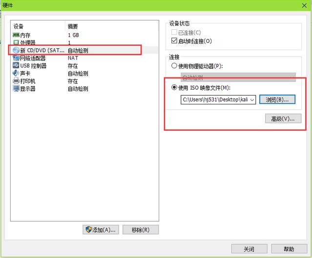 新CD/DVD>使用ISO映像文件>选择Kali的镜像。设置好后点击关闭