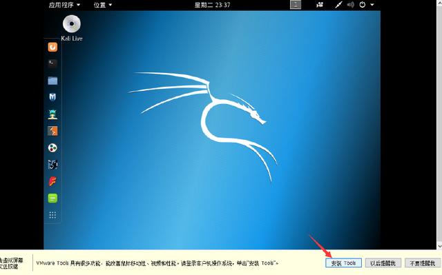 duangduangduang,启动如下。Kali的logo是不是很酷,接下来点击安装Tools。