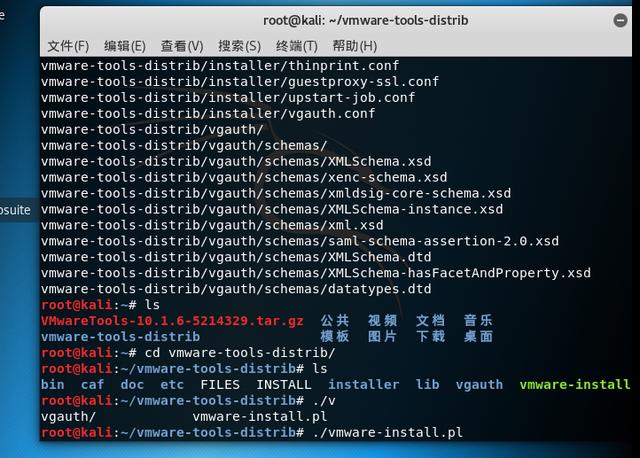 解压好后,ls可以看到我们的解压文件。cd进入,输入./vmware-install.pl运行脚本安装Tools。