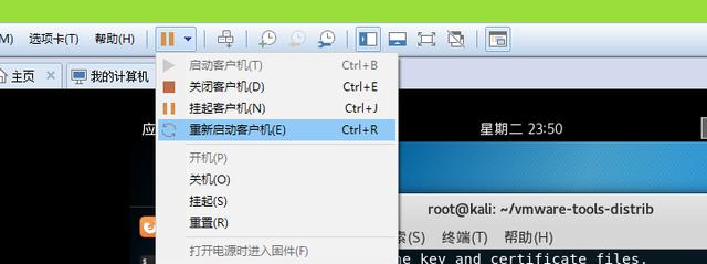 提示安装好后重启虚拟机(进度条可能没走完),就是上面有个播放的按钮下拉里面可以选择重启。